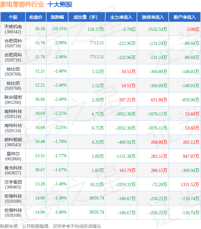 个股表现方面,家电零部件行业当日领跌股为天银机电(300342),该股当日报收26.26,下跌10.31%,成交量129.17万,主力资金净流出2.7亿元。合肥高科(920718)以下跌2.9%紧随其后,该股当日成交量7713.0,主力资金净流出222.96万元。除此之外,合肥高科(920718)、拾比佰(920768)、拾比佰(920768)均进入当日熊股之列。具体个股列表见下表: