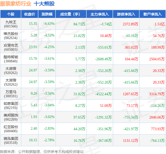 个股表现方面,服装家纺行业当日领跌股为九牧王(601566),该股当日报收15.35,下跌6.63%,成交量84.73万,主力资金净流出1.74亿元。棒杰股份(002634)以下跌4.52%紧随其后,该股当日成交量21.02万,主力资金净流入10.4万元。除此之外,众望布艺(605003)、酷特智能(300840)、太湖雪(920262)均进入当日熊股之列。具体个股列表见下表: