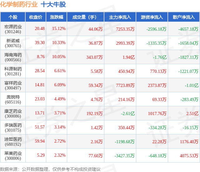 个股表现方面,化学制药行业当日领涨股为宏源药业(301246),该股当日报收20.48,上涨15.12%,成交量44.06万,主力资金净流入7253.35万元。新诺威(300765)以上涨10.33%紧随其后,该股当日成交量36.87万,主力资金净流入2993.39万元。除此之外,海南海药(000566)、科源制药(301281)、富祥药业(300497)均进入当日牛股之列。具体个股列表见下表: