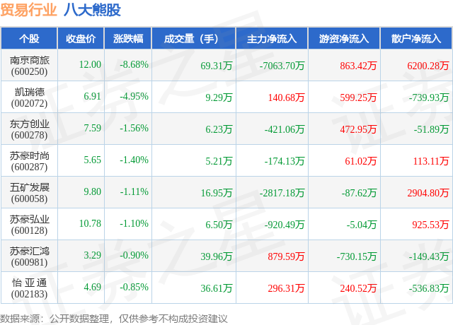 个股表现方面,贸易行业当日领跌股为南京商旅(600250),该股当日报收12.0,下跌8.68%,成交量69.31万,主力资金净流出7063.7万元。凯瑞德(002072)以下跌4.95%紧随其后,该股当日成交量9.29万,主力资金净流入140.68万元。除此之外,东方创业(600278)、苏豪时尚(600287)、五矿发展(600058)均进入当日熊股之列。具体个股列表见下表: