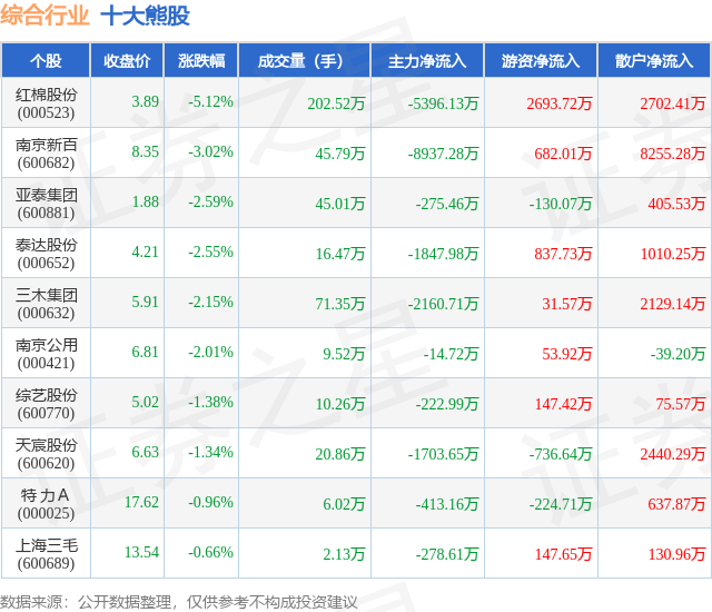 个股表现方面,综合行业当日领跌股为红棉股份(000523),该股当日报收3.89,下跌5.12%,成交量202.52万,主力资金净流出5396.13万元。南京新百(600682)以下跌3.02%紧随其后,该股当日成交量45.79万,主力资金净流出8937.28万元。除此之外,亚泰集团(600881)、泰达股份(000652)、三木集团(000632)均进入当日熊股之列。具体个股列表见下表: