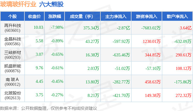 个股表现方面,玻璃玻纤行业当日领跌股为再升科技(603601),该股当日报收10.03,下跌7.98%,成交量375.34万,主力资金净流出2.87亿元。金晶科技(600586)以下跌0.89%紧随其后,该股当日成交量43.27万,主力资金净流出597.92万元。除此之外,三峡新材(600293)、凯盛新能(600876)、南 玻A(000012)均进入当日熊股之列。具体个股列表见下表: