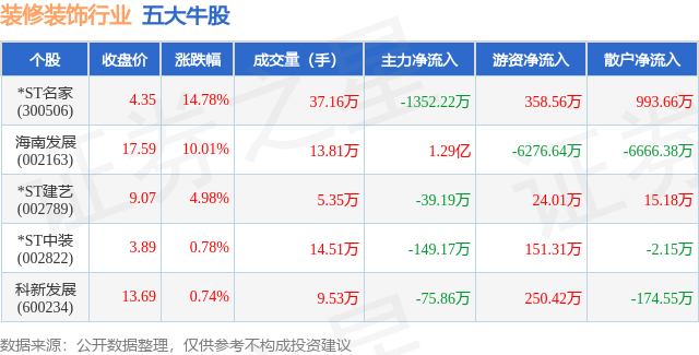 个股表现方面,装修装饰行业当日领涨股为*ST名家(300506),该股当日报收4.35,上涨14.78%,成交量37.16万,主力资金净流出1352.22万元。海南发展(002163)以上涨10.01%紧随其后,该股当日成交量13.81万,主力资金净流入1.29亿元。除此之外,*ST建艺(002789)、*ST中装(002822)、科新发展(600234)均进入当日牛股之列。具体个股列表见下表: