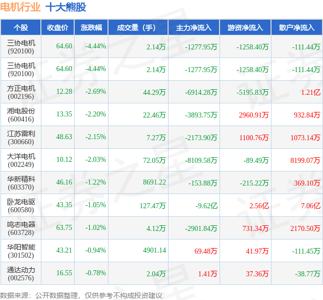 个股表现方面,电机行业当日领跌股为三协电机(920100),该股当日报收64.6,下跌4.44%,成交量2.14万,主力资金净流出1277.95万元。三协电机(920100)以下跌4.44%紧随其后,该股当日成交量2.14万,主力资金净流出1277.95万元。除此之外,方正电机(002196)、湘电股份(600416)、江苏雷利(300660)均进入当日熊股之列。具体个股列表见下表: