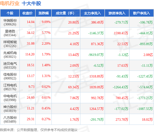 个股表现方面,电机行业当日领涨股为华瑞股份(300626),该股当日报收14.04,上涨9.09%,成交量20.8万,主力资金净流入386.49万元。星德胜(603344)以上涨5.77%紧随其后,该股当日成交量21.29万,主力资金净流出1146.37万元。除此之外,祥明智能(301226)、兆威机电(003021)、迪贝电气(603320)均进入当日牛股之列。具体个股列表见下表: