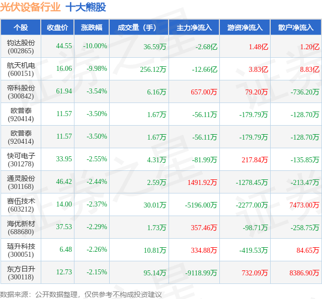 个股表现方面,光伏设备行业当日领跌股为钧达股份(002865),该股当日报收44.55,下跌10.0%,成交量36.59万,主力资金净流出2.68亿元。航天机电(600151)以下跌9.98%紧随其后,该股当日成交量256.12万,主力资金净流出12.66亿元。除此之外,帝科股份(300842)、欧普泰(920414)、欧普泰(920414)均进入当日熊股之列。具体个股列表见下表: