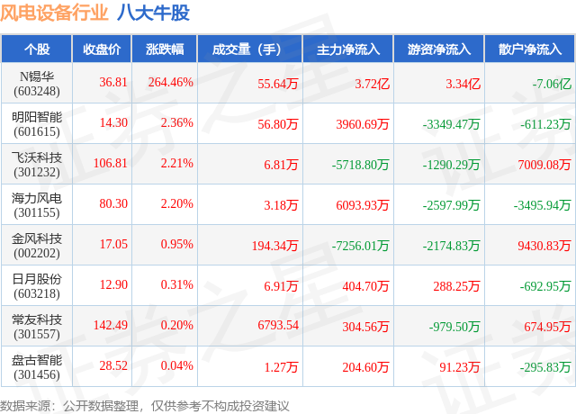 个股表现方面,风电设备行业当日领涨股为N锡华(603248),该股当日报收36.81,上涨264.46%,成交量55.64万,主力资金净流入3.72亿元。明阳智能(601615)以上涨2.36%紧随其后,该股当日成交量56.8万,主力资金净流入3960.69万元。除此之外,飞沃科技(301232)、海力风电(301155)、金风科技(002202)均进入当日牛股之列。具体个股列表见下表: