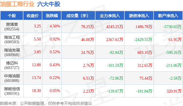 个股表现方面,油服工程行业当日领涨股为惠博普(002554),该股当日报收3.25,上涨4.5%,成交量78.25万,主力资金净流入4243.25万元。海油工程(600583)以上涨0.92%紧随其后,该股当日成交量46.08万,主力资金净流入2367.61万元。除此之外,海油发展(600968)、博迈科(603727)、中海油服(601808)均进入当日牛股之列。具体个股列表见下表: