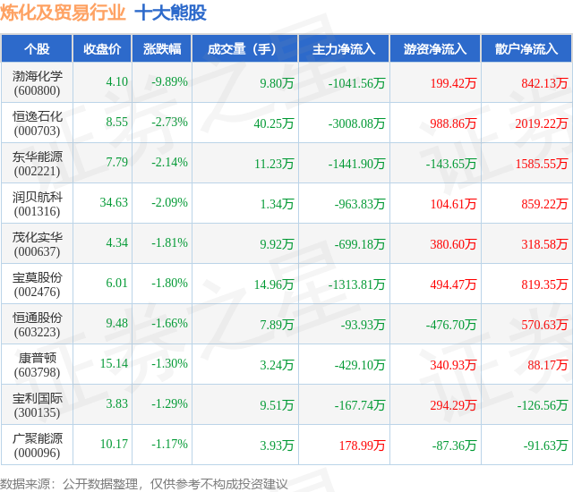 个股表现方面,炼化及贸易行业当日领跌股为渤海化学(600800),该股当日报收4.1,下跌9.89%,成交量9.8万,主力资金净流出1041.56万元。恒逸石化(000703)以下跌2.73%紧随其后,该股当日成交量40.25万,主力资金净流出3008.08万元。除此之外,东华能源(002221)、润贝航科(001316)、茂化实华(000637)均进入当日熊股之列。具体个股列表见下表: