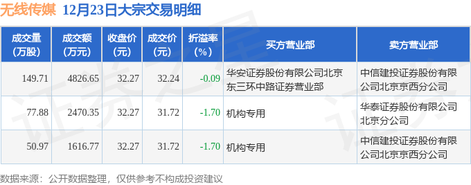 证券之星消息,12月23日无线传媒发生大宗交易,交易数据如下: