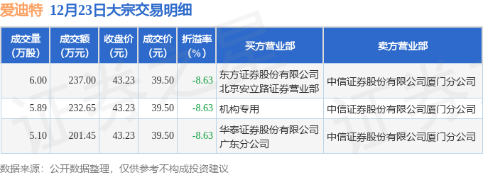 证券之星消息,12月23日爱迪特发生大宗交易,交易数据如下: