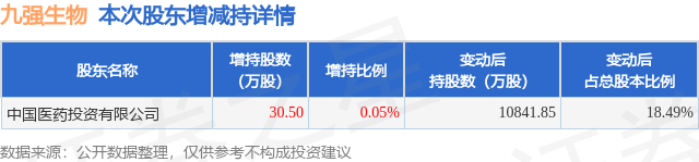 证券之星消息,12月23日九强生物发布公告《九强生物:关于公司持股5%以上股东增持公司股份计划实施完毕的公告》,其股东中国医药投资有限公司于2025年9月23日至2025年12月22日间合计增持30.5万股,占公司目前总股本的0.052%,变动期间该股股价下跌0.37%,截止12月22日收盘报13.33元。
