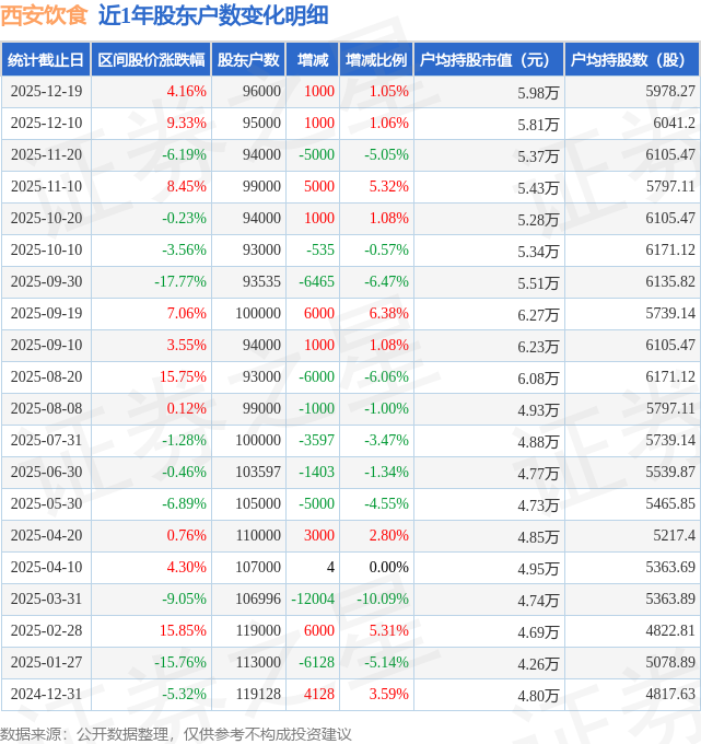从股价来看,2025年12月10日至2025年12月19日,西安饮食区间涨幅为4.16%,在此期间股东户数增加1000.0户,增幅为1.05%。