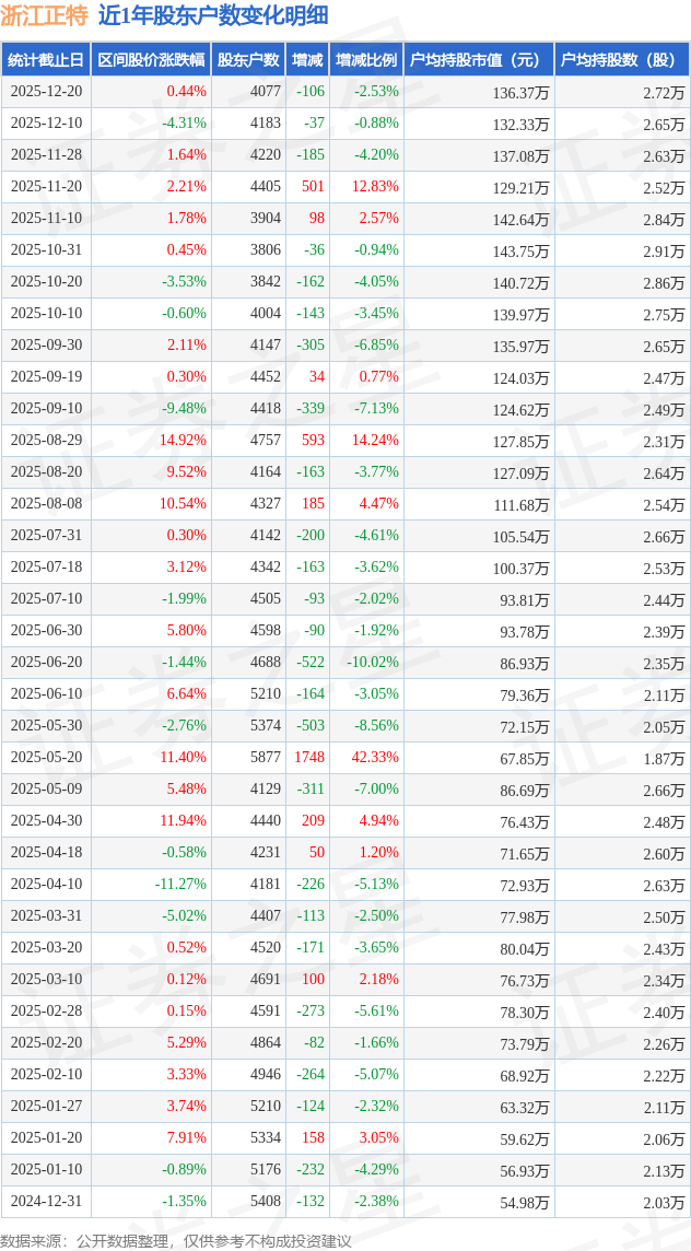 从股价来看,2025年12月10日至2025年12月20日,浙江正特区间涨幅为0.44%,在此期间股东户数减少106.0户,减幅为2.53%。
