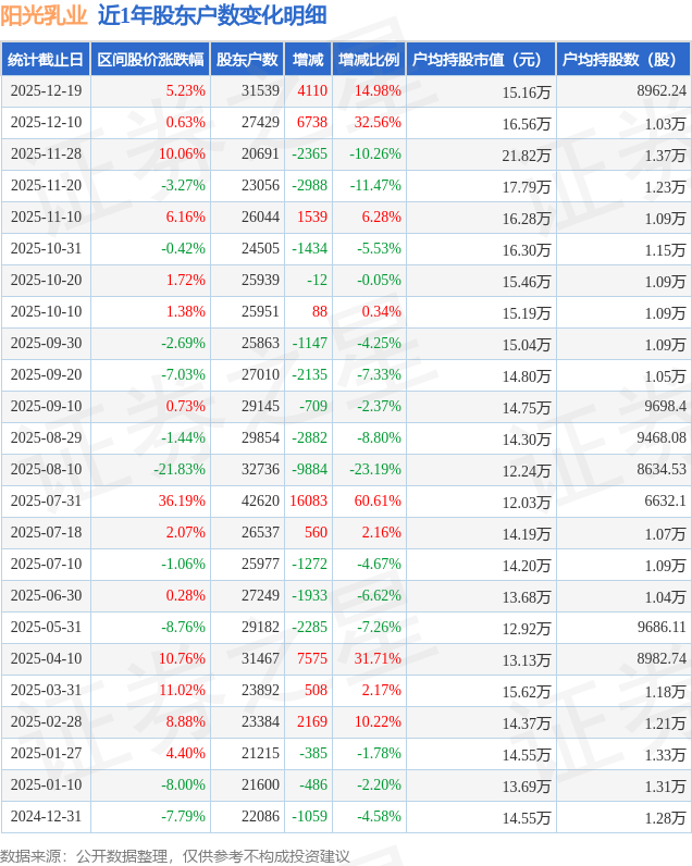 从股价来看,2025年12月10日至2025年12月19日,阳光乳业区间涨幅为5.23%,在此期间股东户数增加4110.0户,增幅为14.98%。