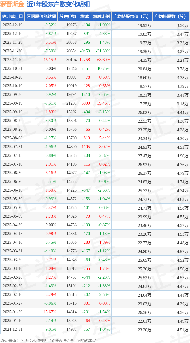 从股价来看,2025年12月10日至2025年12月19日,罗普斯金区间跌幅为0.52%,在此期间股东户数减少194.0户,减幅为1.0%。