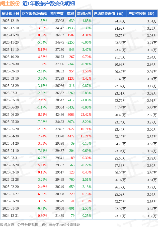 从股价来看,2025年12月10日至2025年12月19日,闰土股份区间跌幅为1.57%,在此期间股东户数减少639.0户,减幅为1.85%。