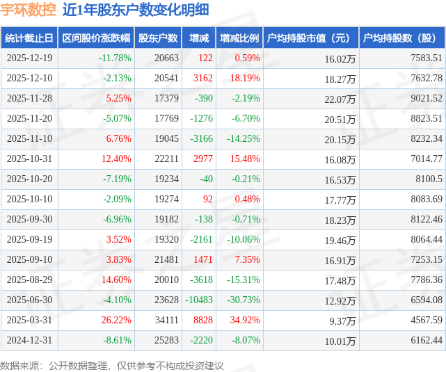 证券之星消息,近日宇环数控披露,截至2025年12月19日公司股东户数为2.07万户,较12月10日增加122.0户,增幅为0.59%。户均持股数量由上期的7633.0股减少至7584.0股,户均持股市值为16.02万元。