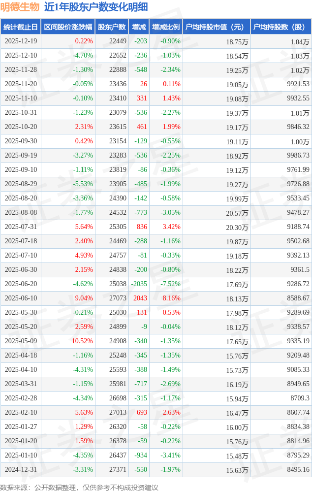 从股价来看,2025年12月10日至2025年12月19日,明德生物区间涨幅为0.22%,在此期间股东户数减少203.0户,减幅为0.9%。