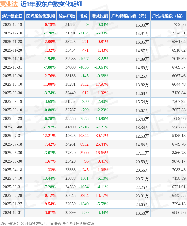 证券之星消息,近日竞业达披露,截至2025年12月19日公司股东户数为3.16万户,较12月10日减少9.0户,减幅为0.03%。户均持股数量由上期的7325.0股增加至7327.0股,户均持股市值为15.03万元。