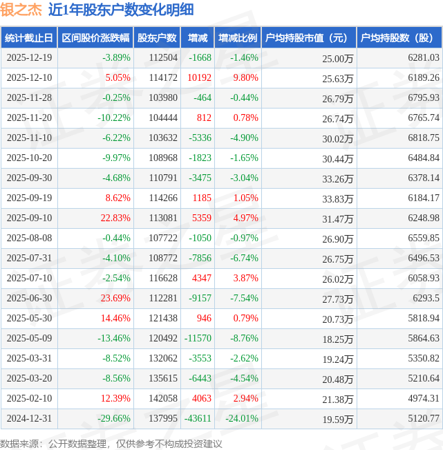 从股价来看,2025年12月10日至2025年12月19日,银之杰区间跌幅为3.89%,在此期间股东户数减少1668.0户,减幅为1.46%。