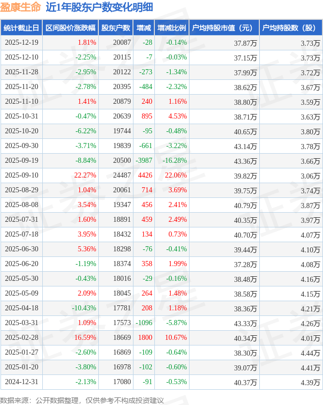 从股价来看,2025年12月10日至2025年12月19日,盈康生命区间涨幅为1.81%,在此期间股东户数减少28.0户,减幅为0.14%。