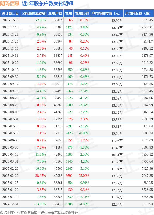 从股价来看,2025年12月10日至2025年12月19日,朗玛信息区间跌幅为2.8%,在此期间股东户数增加66.0户,增幅为0.19%。
