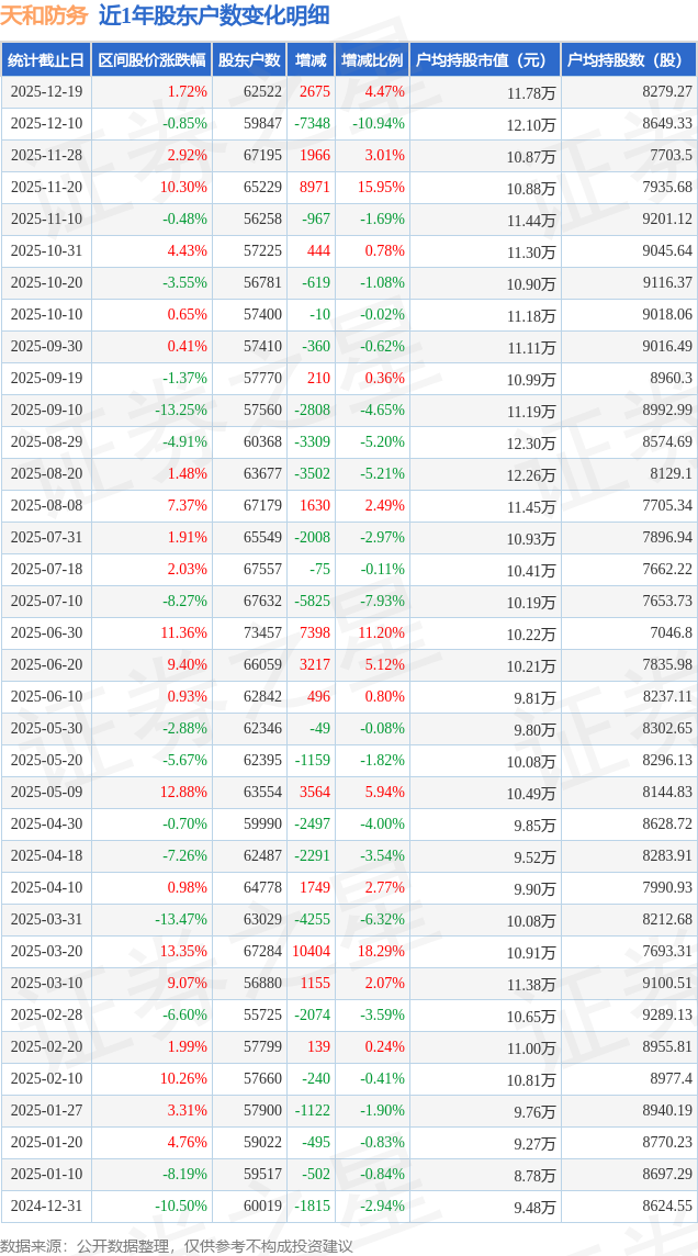 从股价来看,2025年12月10日至2025年12月19日,天和防务区间涨幅为1.72%,在此期间股东户数增加2675.0户,增幅为4.47%。