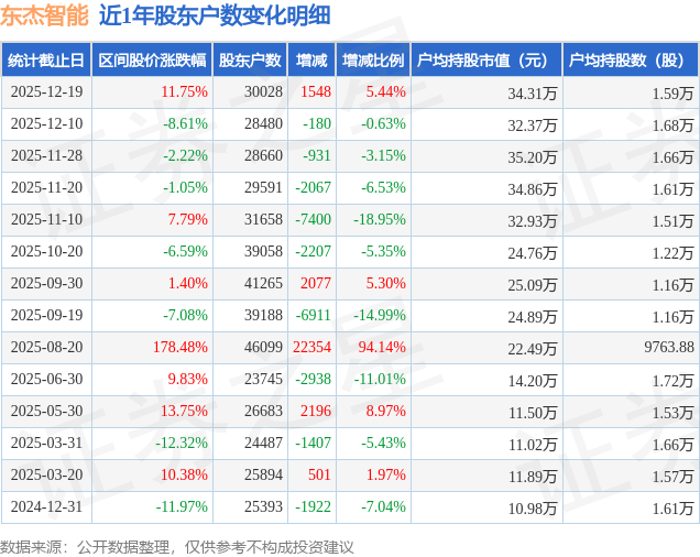 从股价来看,2025年12月10日至2025年12月19日,东杰智能区间涨幅为11.75%,在此期间股东户数增加1548.0户,增幅为5.44%。