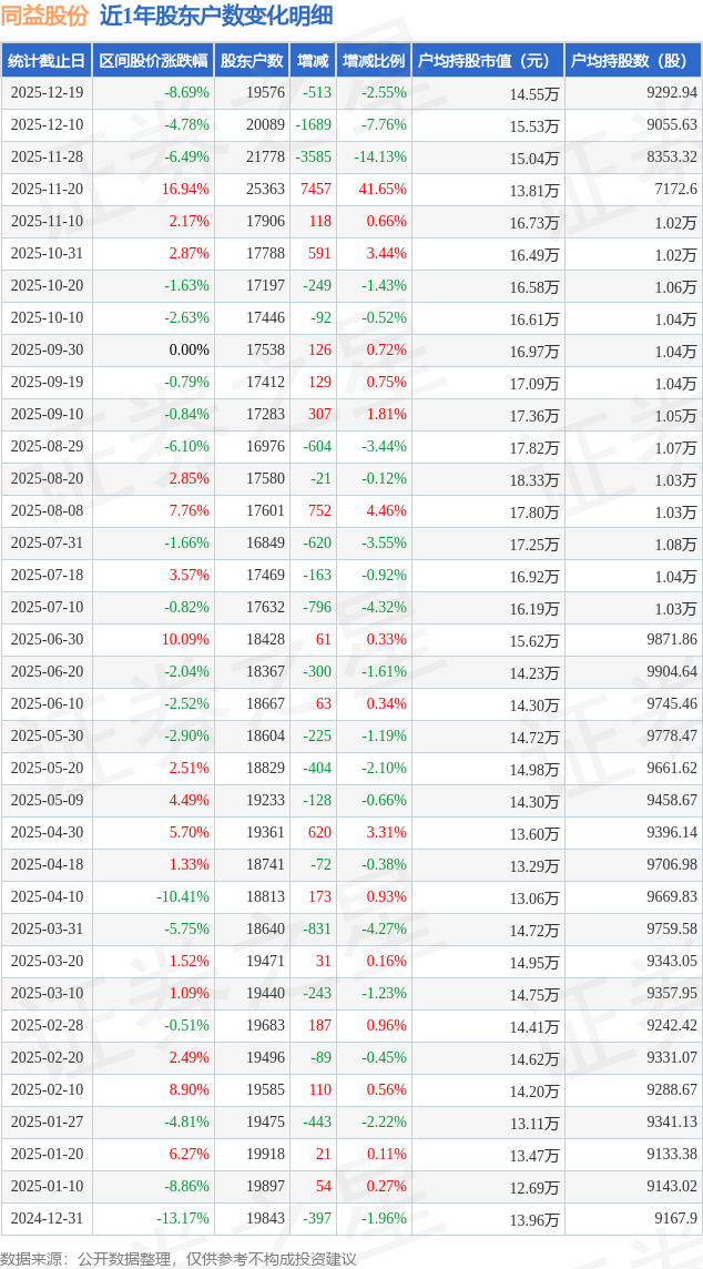 从股价来看,2025年12月10日至2025年12月19日,同益股份区间跌幅为8.69%,在此期间股东户数减少513.0户,减幅为2.55%。