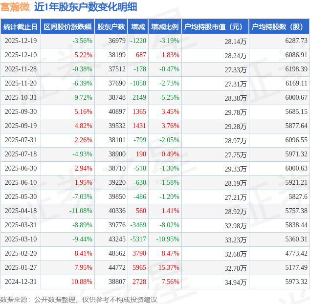 从股价来看,2025年12月10日至2025年12月19日,富瀚微区间跌幅为3.56%,在此期间股东户数减少1220.0户,减幅为3.19%。
