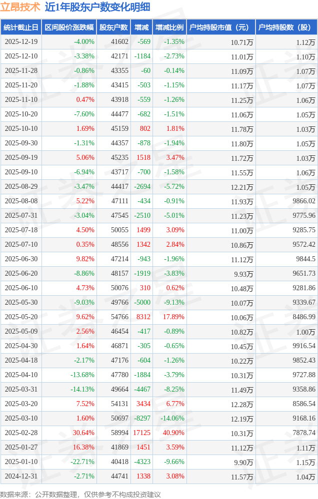 从股价来看,2025年12月10日至2025年12月19日,立昂技术区间跌幅为4.0%,在此期间股东户数减少569.0户,减幅为1.35%。