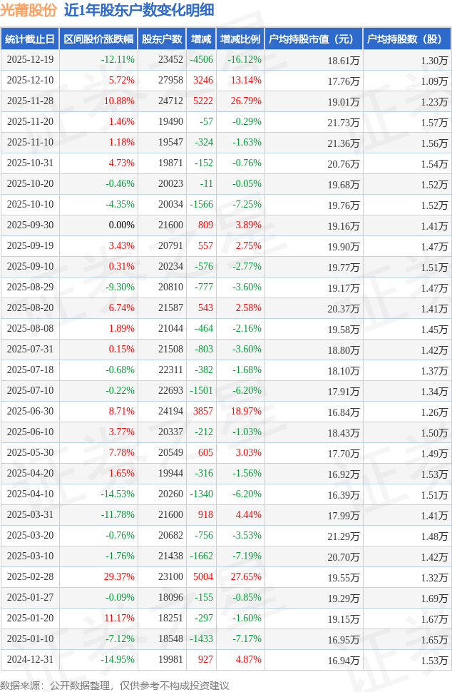 从股价来看,2025年12月10日至2025年12月19日,光莆股份区间跌幅为12.11%,在此期间股东户数减少4506.0户,减幅为16.12%。