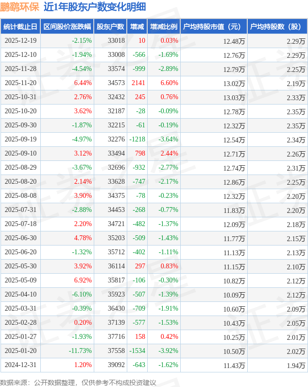 从股价来看,2025年12月10日至2025年12月19日,鹏鹞环保区间跌幅为2.15%,在此期间股东户数增加10.0户,增幅为0.03%。