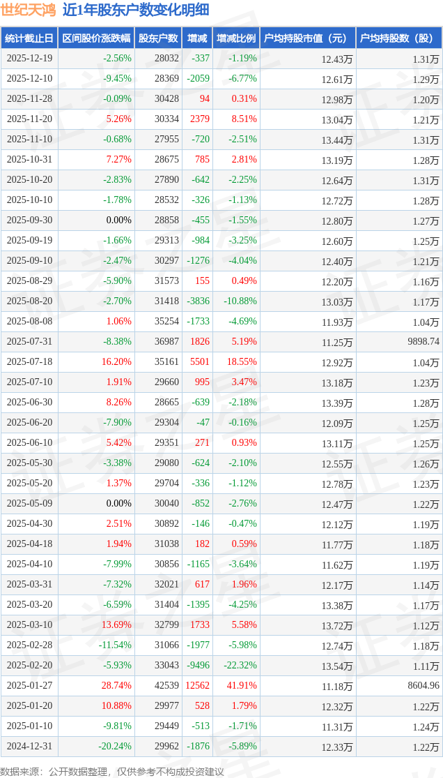 从股价来看,2025年12月10日至2025年12月19日,世纪天鸿区间跌幅为2.56%,在此期间股东户数减少337.0户,减幅为1.19%。