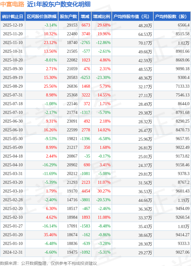 从股价来看,2025年11月20日至2025年12月19日,中富电路区间跌幅为3.14%,在此期间股东户数增加6673.0户,增幅为29.68%。