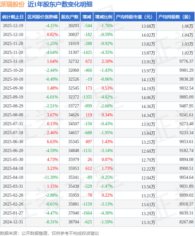 从股价来看,2025年12月10日至2025年12月19日,派瑞股份区间跌幅为4.15%,在此期间股东户数减少544.0户,减幅为1.76%。