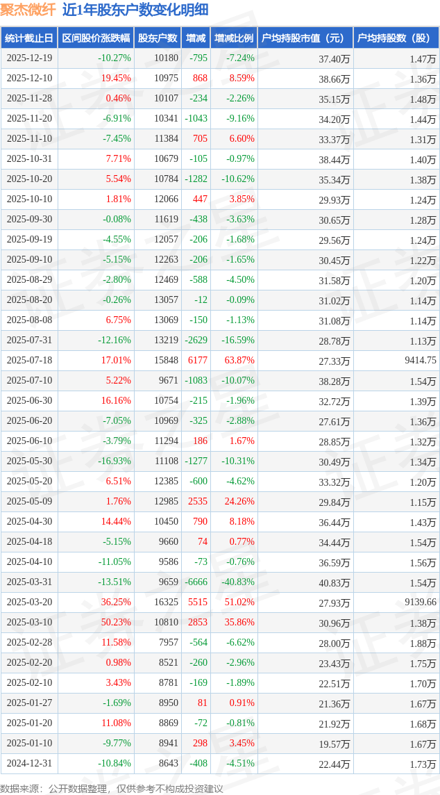 从股价来看,2025年12月10日至2025年12月19日,聚杰微纤区间跌幅为10.27%,在此期间股东户数减少795.0户,减幅为7.24%。