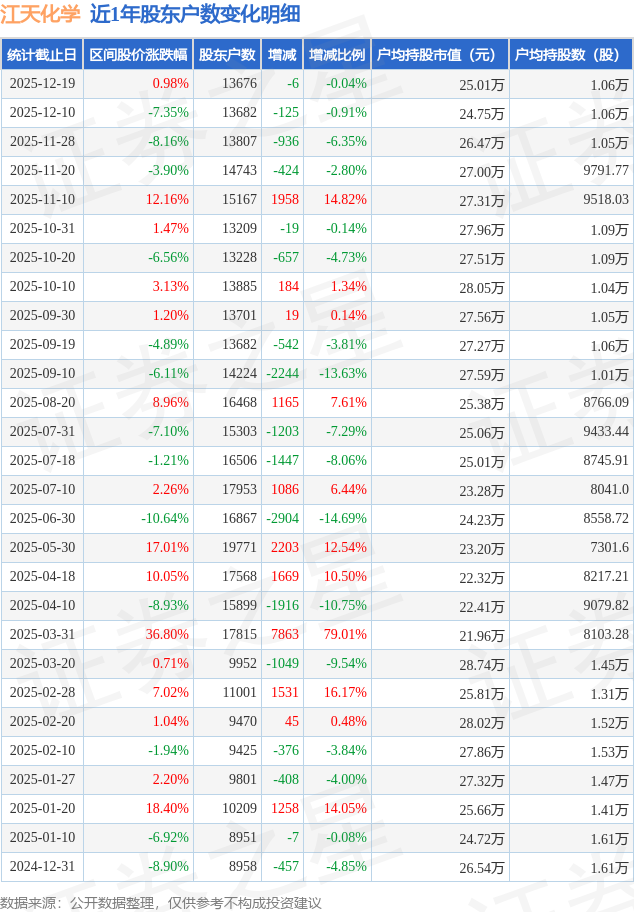 从股价来看,2025年12月10日至2025年12月19日,江天化学区间涨幅为0.98%,在此期间股东户数减少6.0户,减幅为0.04%。