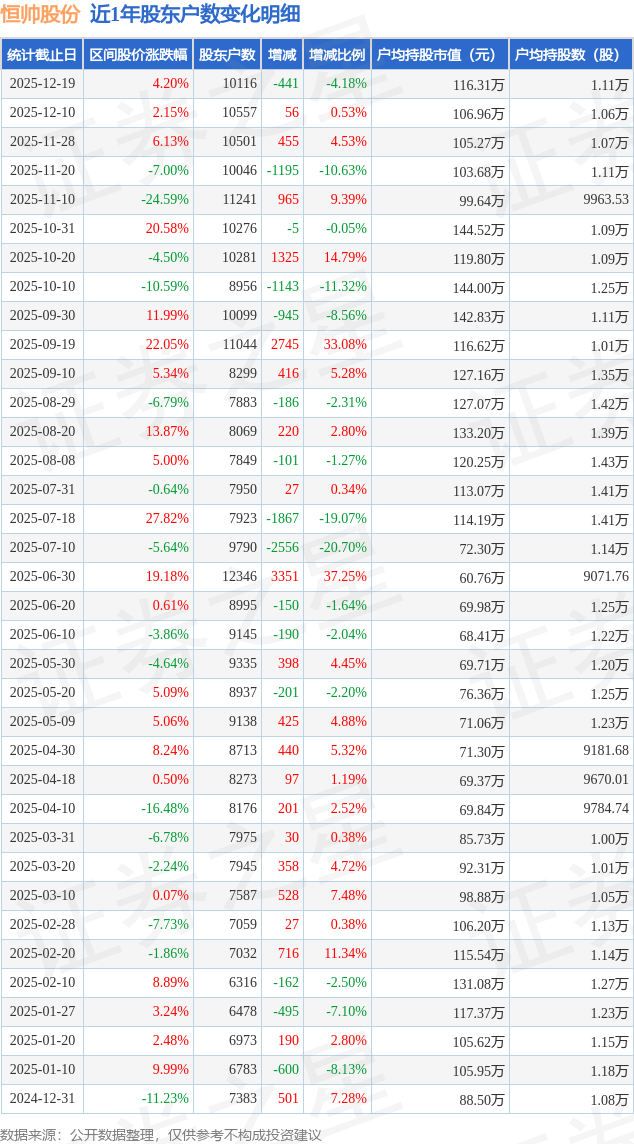 从股价来看,2025年12月10日至2025年12月19日,恒帅股份区间涨幅为4.2%,在此期间股东户数减少441.0户,减幅为4.18%。