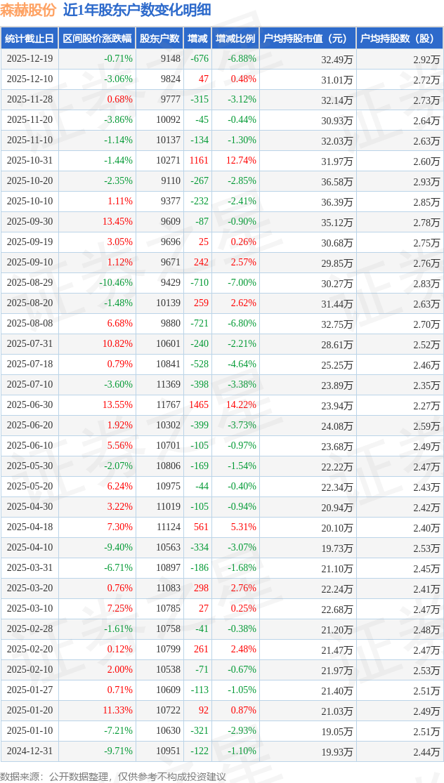 从股价来看,2025年12月10日至2025年12月19日,森赫股份区间跌幅为0.71%,在此期间股东户数减少676.0户,减幅为6.88%。