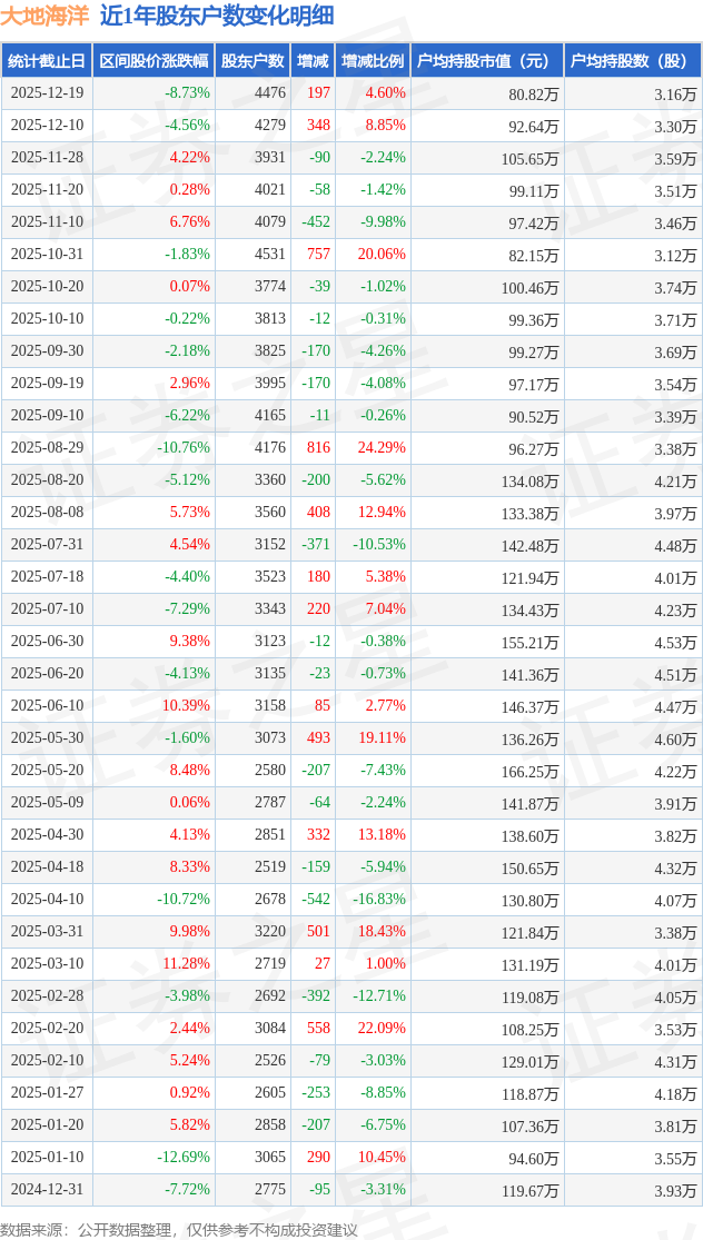从股价来看,2025年12月10日至2025年12月19日,大地海洋区间跌幅为8.73%,在此期间股东户数增加197.0户,增幅为4.6%。