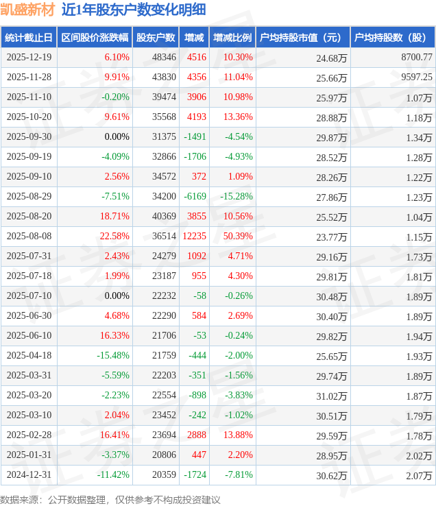从股价来看,2025年11月28日至2025年12月19日,凯盛新材区间涨幅为6.1%,在此期间股东户数增加4516.0户,增幅为10.3%。