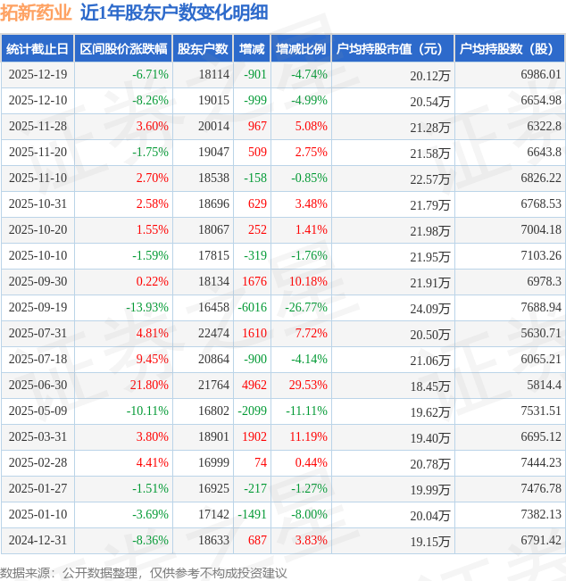 从股价来看,2025年12月10日至2025年12月19日,拓新药业区间跌幅为6.71%,在此期间股东户数减少901.0户,减幅为4.74%。
