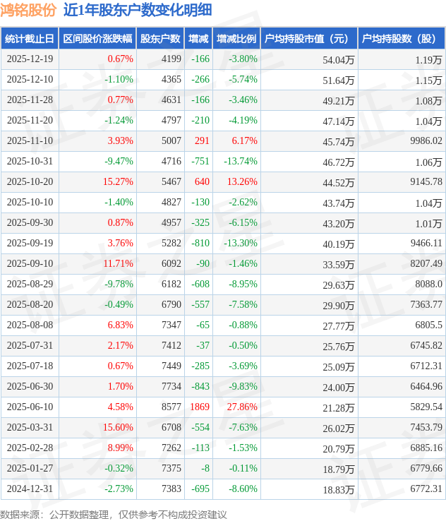从股价来看,2025年12月10日至2025年12月19日,鸿铭股份区间涨幅为0.67%,在此期间股东户数减少166.0户,减幅为3.8%。