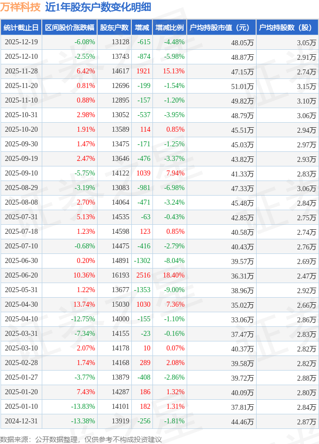 从股价来看,2025年12月10日至2025年12月19日,万祥科技区间跌幅为6.08%,在此期间股东户数减少615.0户,减幅为4.48%。
