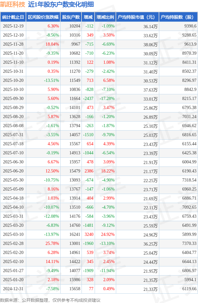 从股价来看,2025年12月10日至2025年12月19日,凯旺科技区间涨幅为6.3%,在此期间股东户数减少112.0户,减幅为1.09%。