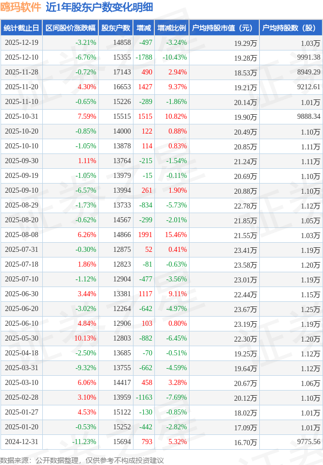 从股价来看,2025年12月10日至2025年12月19日,鸥玛软件区间跌幅为3.21%,在此期间股东户数减少497.0户,减幅为3.24%。