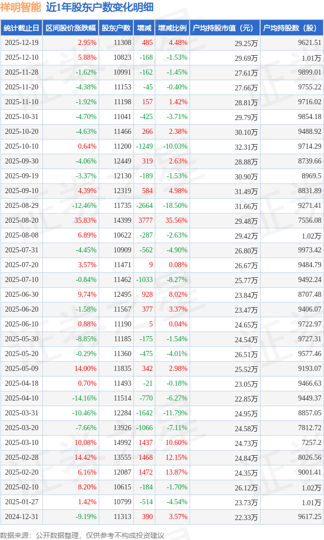 从股价来看,2025年12月10日至2025年12月19日,祥明智能区间涨幅为2.95%,在此期间股东户数增加485.0户,增幅为4.48%。