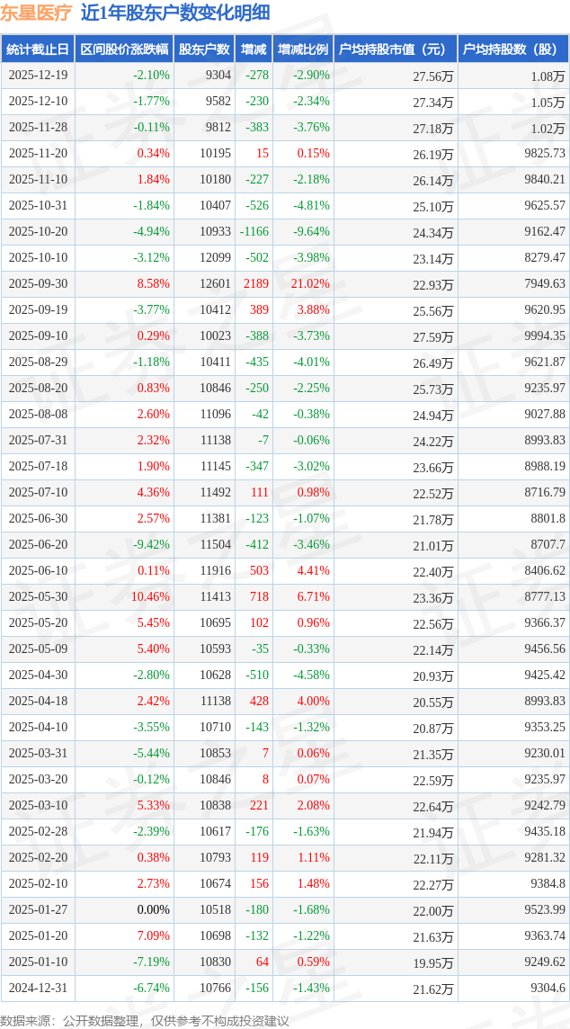 从股价来看,2025年12月10日至2025年12月19日,东星医疗区间跌幅为2.1%,在此期间股东户数减少278.0户,减幅为2.9%。